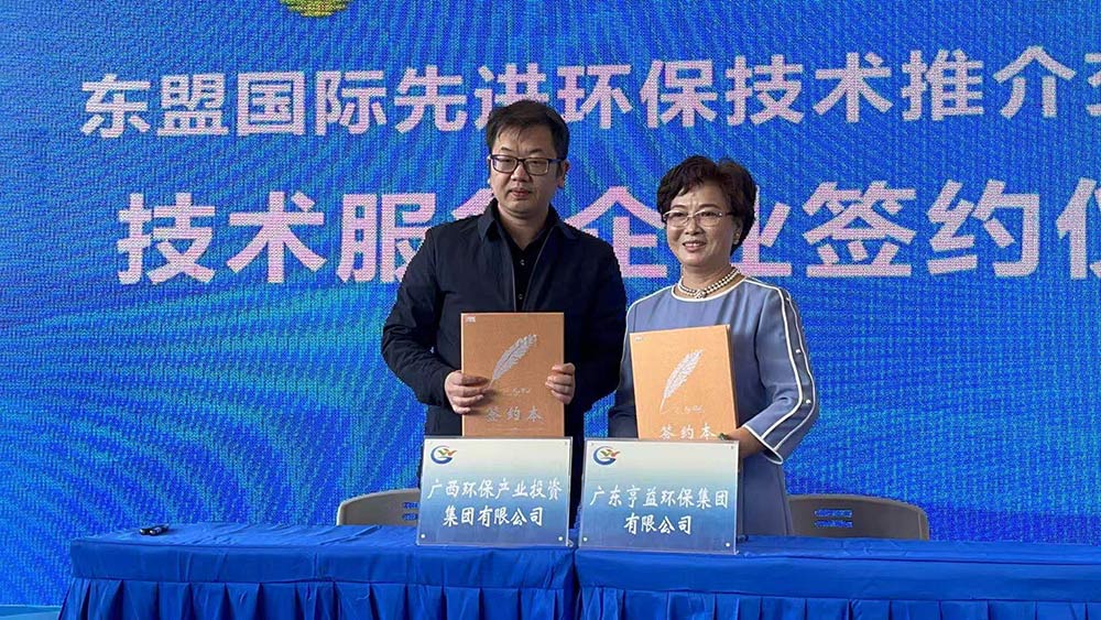 下午,承办方广西环保集团举行了技术服务项目签约仪式,广西环保集团常务副总经理王兵广东狗子28集团有限公司董事长张玲萍女士签署了技术服务项目协议。